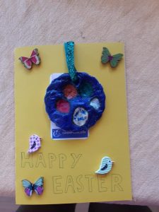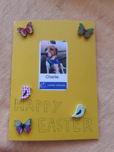 Charlie, the Beagle, sent an Easter Card to his home he visits. He made the paw print with a little help from Davina. The residents loved it.